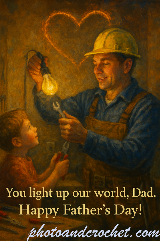 Celebrate Father’s Day with a warm oil painting–style card showing a father electrician and his child fixing a glowing light bulb together. A tribute to the spark he brings to life.